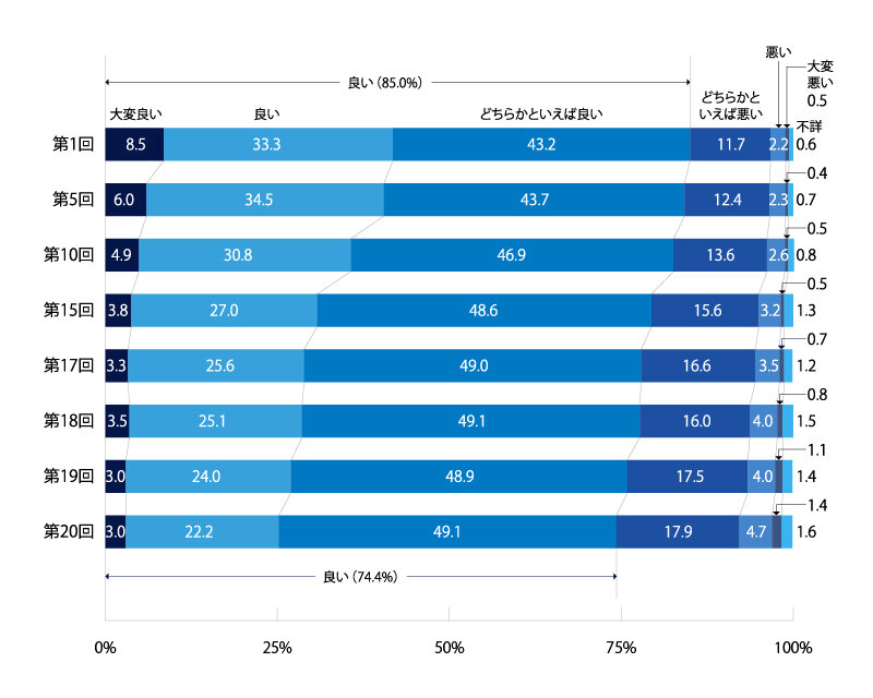 第1回調査から19年間の健康状態の変化をみると、「良い」と思っている者は、第1回:85.0%から第20回:74.4%と年齢を重ねることで減少しています(図1)。