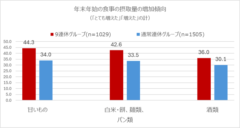 ・年末年始の食事で摂取量が増えた食べ物を聞いたところ、9連休以上グループの44%が「甘いもの」、43%が 「炭水化物」と回答。通常連休グループとは10pt程度の開き