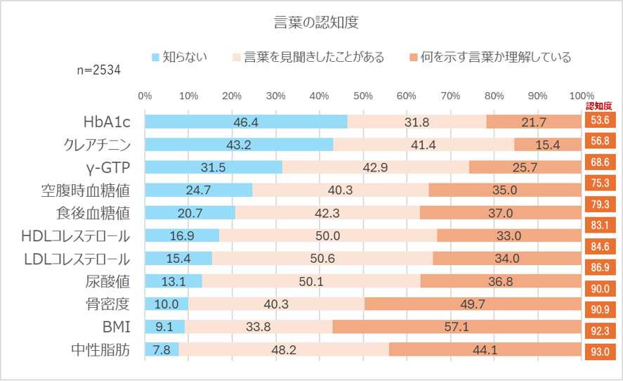 健康診断の項目の中で、認知度が最も低かったのは「HbA1c」で、約半数の46.4%の人が「知らない」と回答しました。生活習慣病の中で最もなりたくない病気の1位が糖尿病だったにも関わらず、血糖値の状態を知る上で重要な指標であるHbA1cを知らない人が約半数いるという矛盾した結果に。 和田氏は、「アルファベットと数字の組み合わせから、血糖値に関する指標とイメージしにくい人もいると思う。しかしながら、前述した通り、血糖値のコントロールにおいて非常に重要な指標であるため、ぜひ一人でも多くの方にその存在と意味合いを正しく理解して欲しい」とコメントしています。