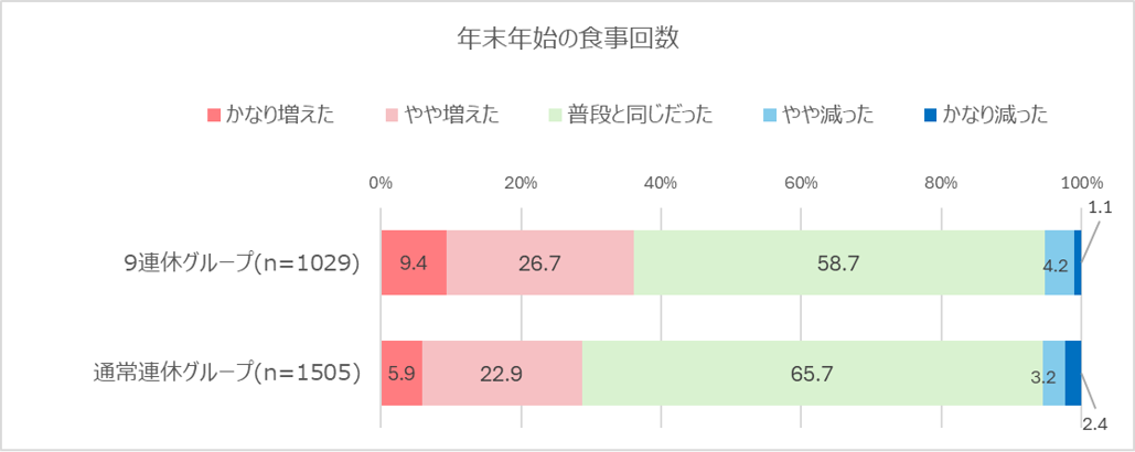【年末年始~冬の生活習慣の乱れ実態】 【1】年末年始の食事の回数:9連休以上グループの36.1%が「普段よりも増えた」と回答年末年始の食事の回数が「普段よりも増えた」と回答した人の割合は、9連休以上グループでは36.1%だったのに対し、通常連休グループでは28.8%と、7pt以上の大きな差がありました。 和田氏は「自由時間が多いため、通常よりも食事のタイミングが不規則になり、食事間食が増えたと考えられる」と分析しています。