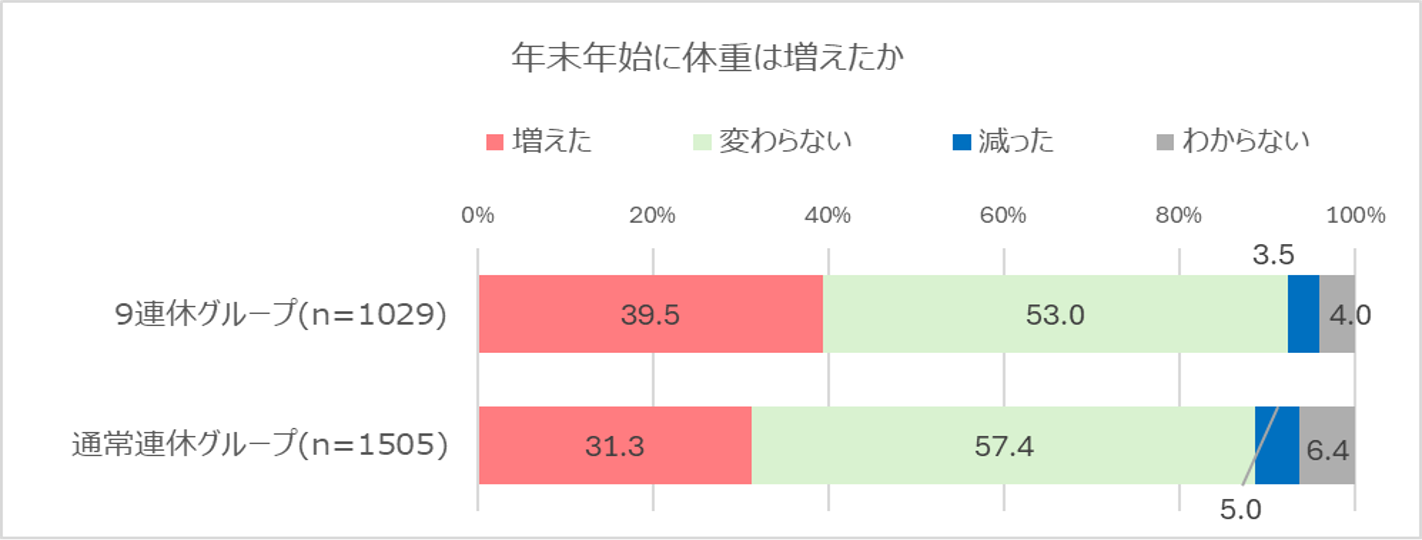 年末年始の体重について、9連休以上グループでは39.5%が「増えた」と回答。通常連休グループでは31.3%と、約8ptの差がありました。 和田氏は 「年末年始の体重の増加は、暴飲暴食による摂取エネルギーの増加と運動量の低下による消費エネルギーの減少の結果」と分析しています。