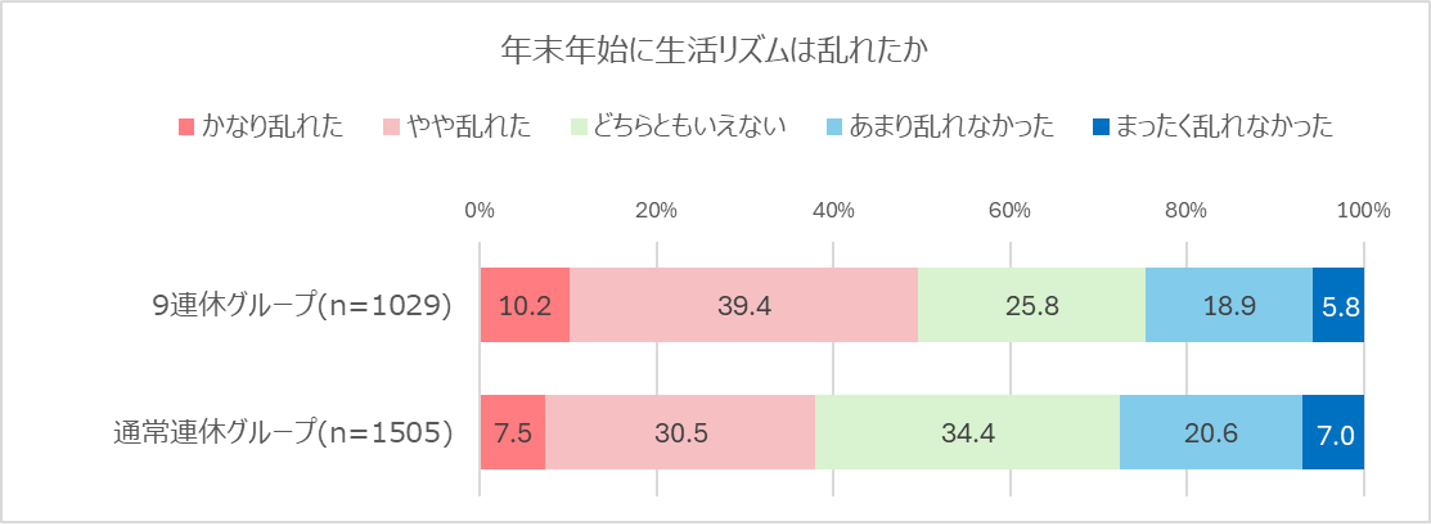 ・年末年始の生活リズムの乱れについて9連休以上グループで「50%が乱れた」、通常連休グループでは「38%が乱れた」と、12ptの開き