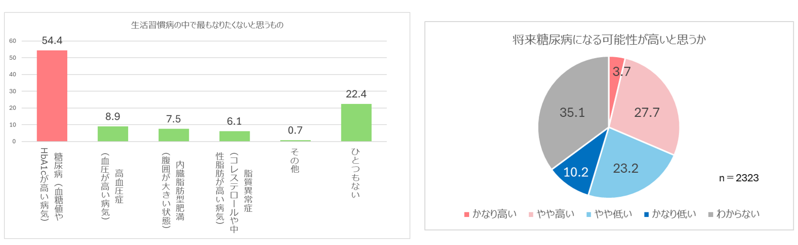「生活習慣病の中で最もなりたくないもの」への回答では、「糖尿病」が54.4%と1位で、内臓脂肪型肥満や高血圧症、脂質異常症など他の疾病と大きく差がある結果となりました。 さらに「自身が糖尿病になる可能性が高いと思うか」という質問では、31.4%が「高いと思う」と回答しており、その理由としては、「炭水化物が好きだから」が48.4%で1位、「スイーツや甘い飲料が好きだから」が48.2%で2位と、食事面での不安が大きく出た結果となりました。