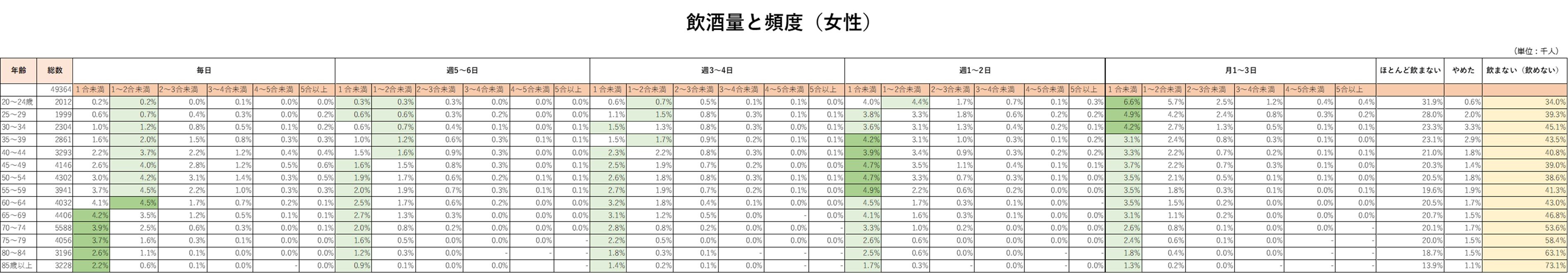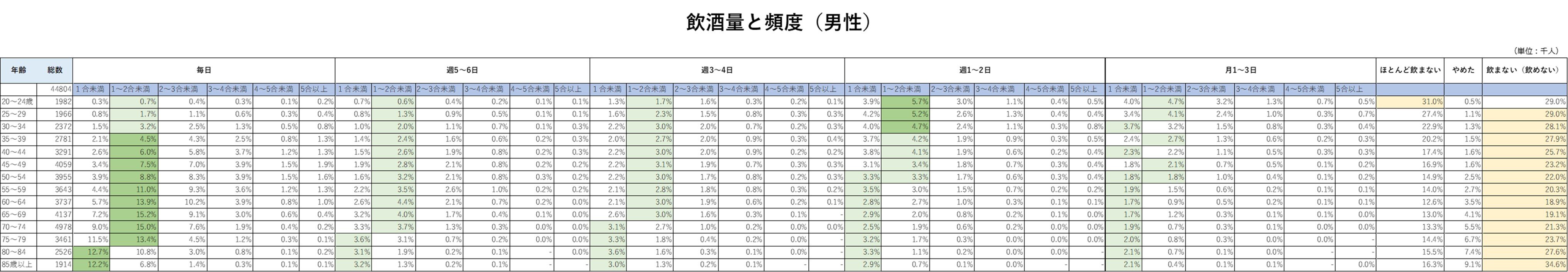 下記表では、世代別・性別ごとの飲酒量と頻度について示しています。 月に1回以上飲酒している人のうち、世代別に回答数が多かったものを緑色、もっとも回答数が多かったものを濃い緑色で示しています。