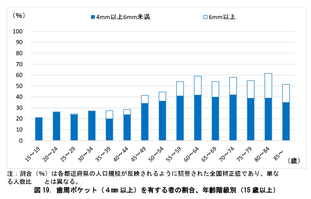 【歯周ポケット(4mm以上)を有する者の割合、年齢階級別(15歳以上)】