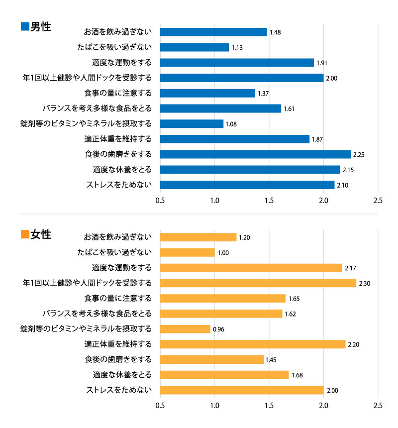 女性では「年1回以上の健診や人間ドックを受ける(2.30倍)」「適正体重を維持する(2.20倍)」「適度な運動をする(2.17倍)」「ストレスをためない(2.00倍)」「適度な休養をとる(1.68倍)」でした。